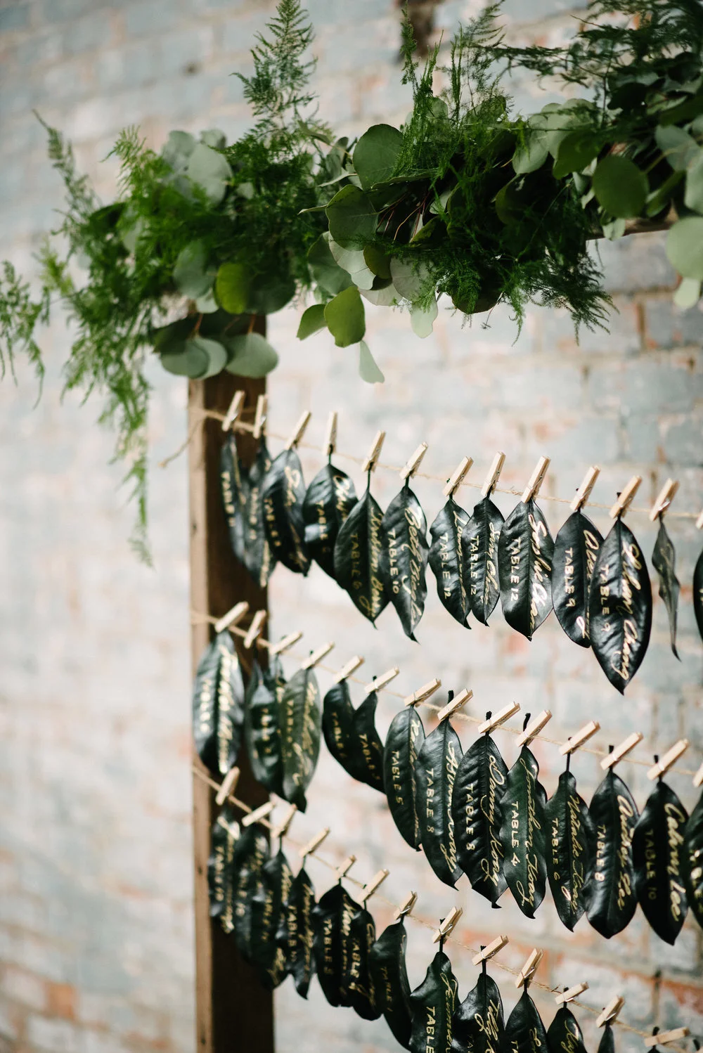 I crafted several hand-lettered pieces for Evelyn and Jed's Hudson Valley wedding. Held in the industrial chic Basilica Hudson two hours outside New York City, the organic leaf elements with gold calligraphy were a glam and soft touch to contrast the brick and concrete of the venue.