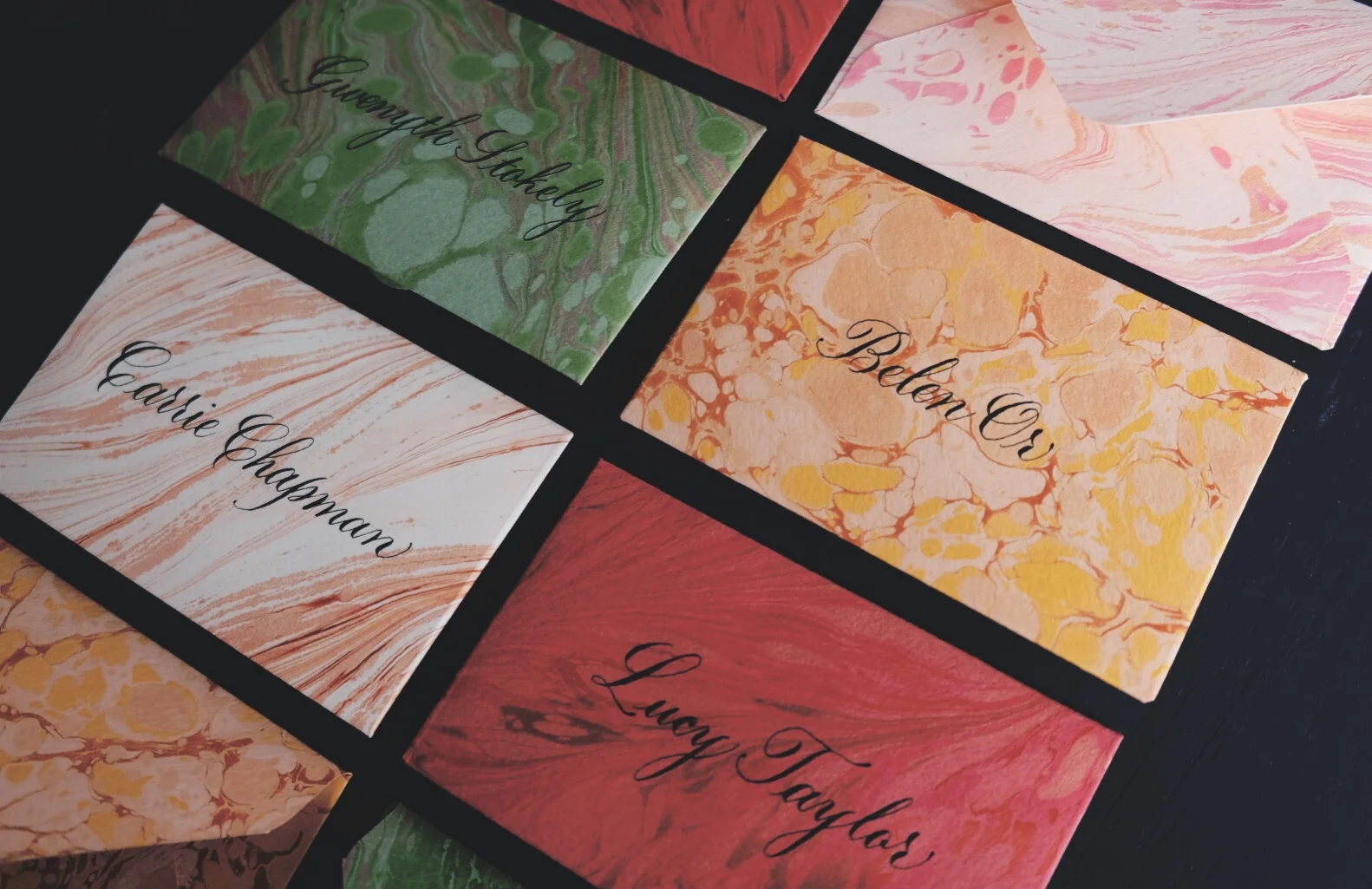 Marbled paper has often been used in book binding for the inside cover pages—check out old books from centuries ago!—but because of how beautifully decorative it is, I could see myself loving a whole accent wall of marbled wallpaper (please tell me this exists?!). Either way, it’s a great way to add elegant decoration to an everyday book, an interior space, stationery, and of course, a fabulous event! Pair marbling with elegant calligraphy and you’ve got yourself some traditional but “elevated” (that’s the hip word these days, right?) place cards with a color palette to perfectly match your affair.