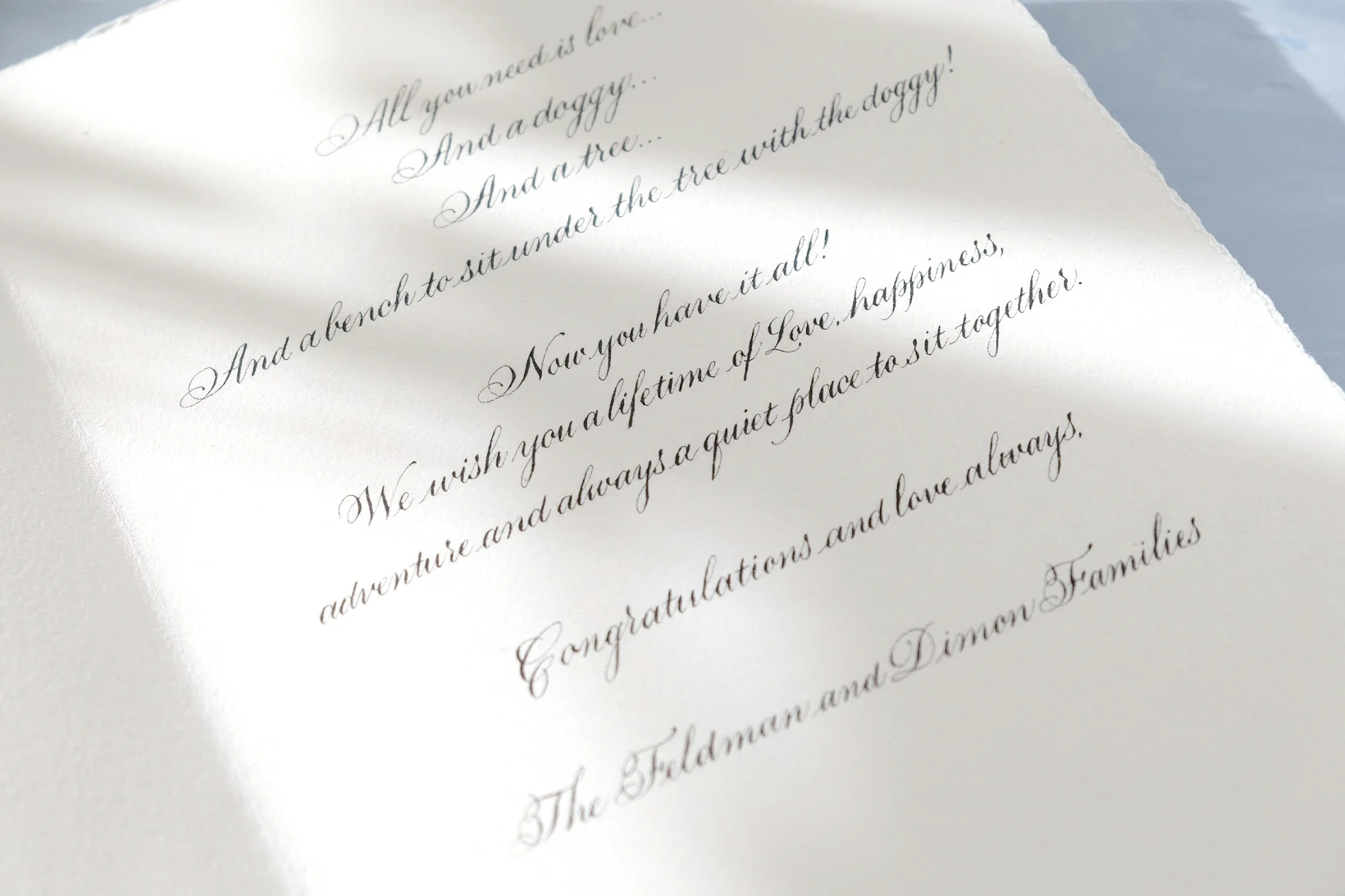 I was commissioned by a family to inscribe the inside of a home-made wedding congratulations card. While the cover had a beautiful custom watercolor painting of the couple (by another artist), their message was written in classic copperpate script on the inside.