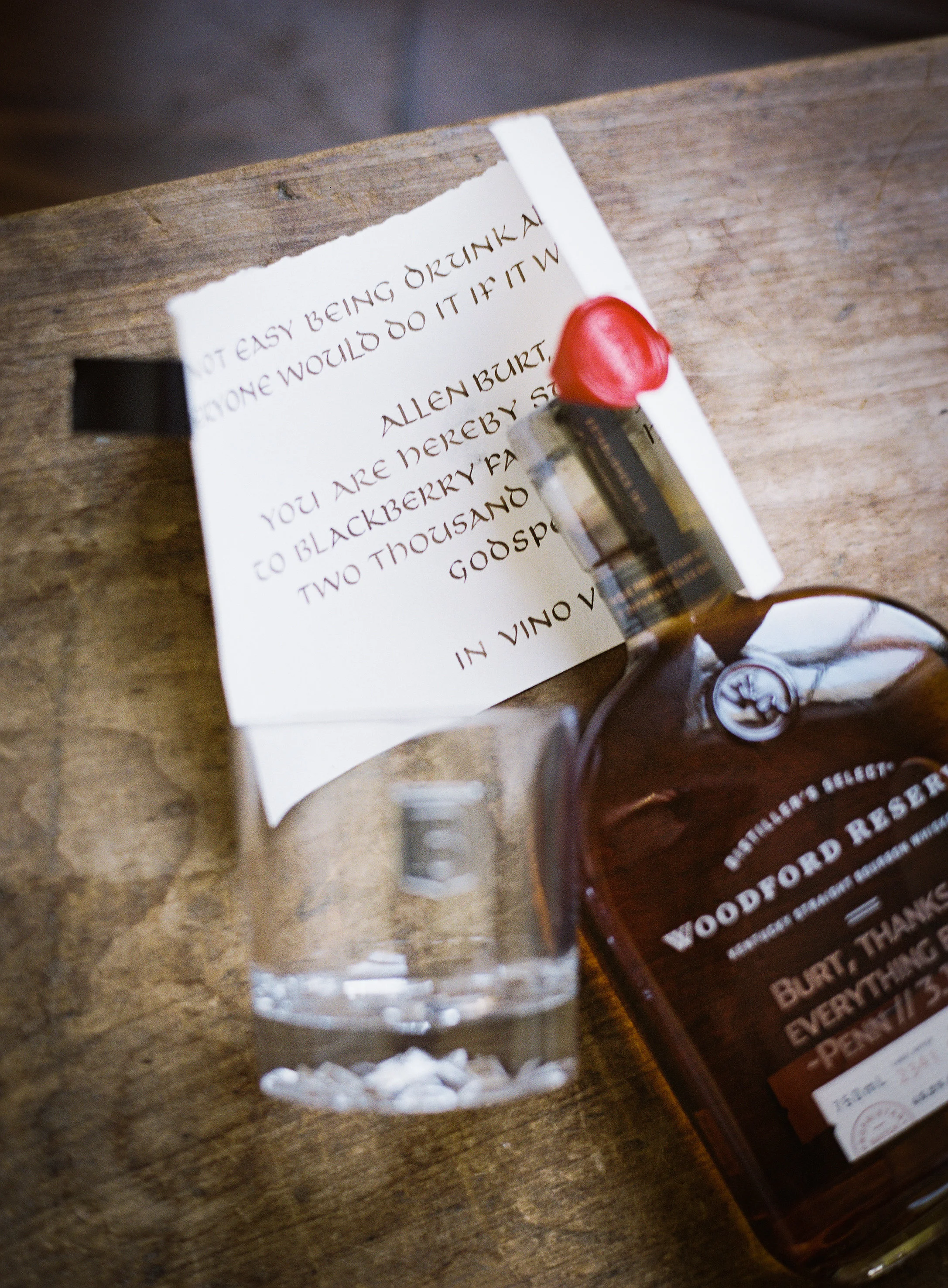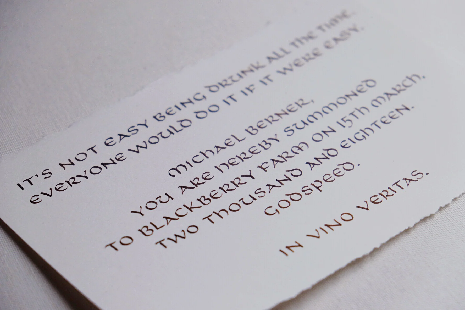 This hand-crafted calligraphy scroll was written and mailed out to each of the eight groomsmen for Rachel and Allen's Blackberry Farm wedding. Written in Uncial hand using walnut ink on Stonehenge watercolor paper, the scroll was sealed with red wax with a quill design for special antique touch.
